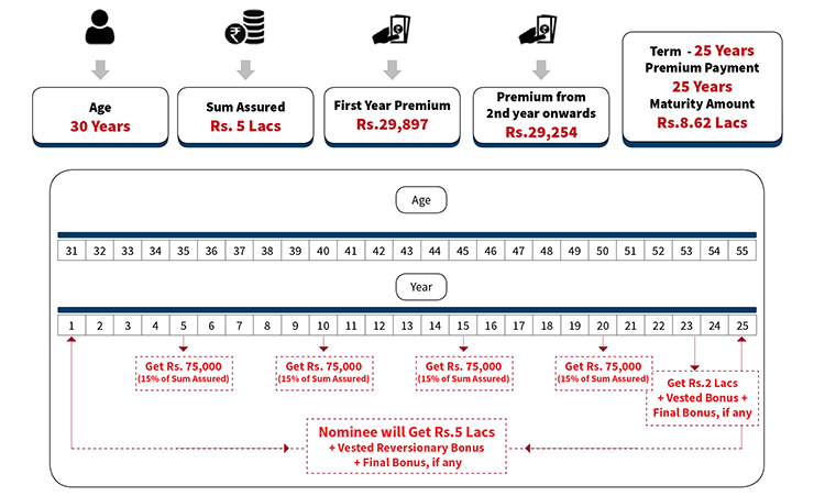 • This plan offers guaranteed tax-free 15% of Sum Assured in 5th, 10th, 15th & 20th Year of the policy. The premium payment term in this plan is 20 years.